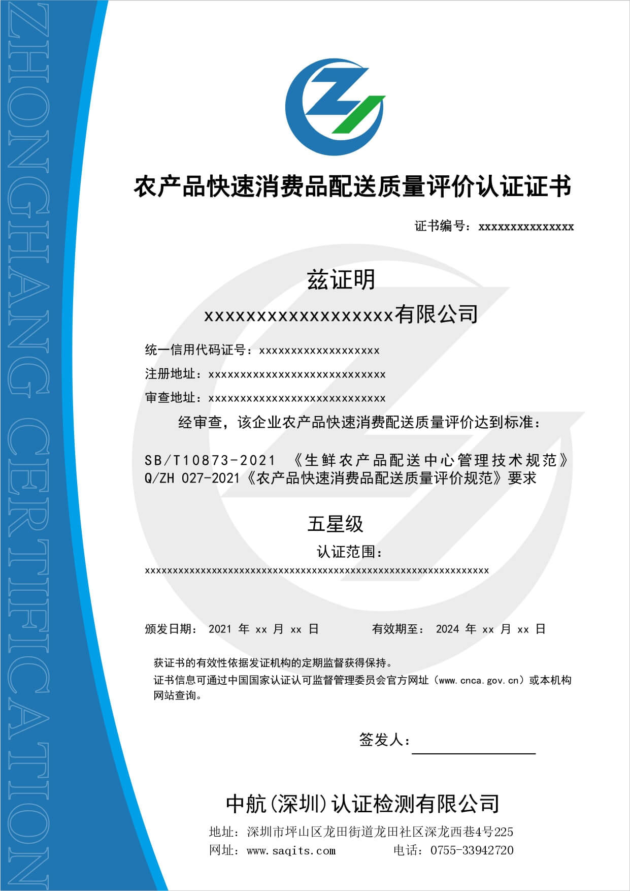 农产品快速消费品配送质量评价认证证书:在全程配送过程中采用的设备技术含量高,保护产品免受生化危害;配送处于中间环节,是解决食品安全关键问题的动态系统...查看更多>>