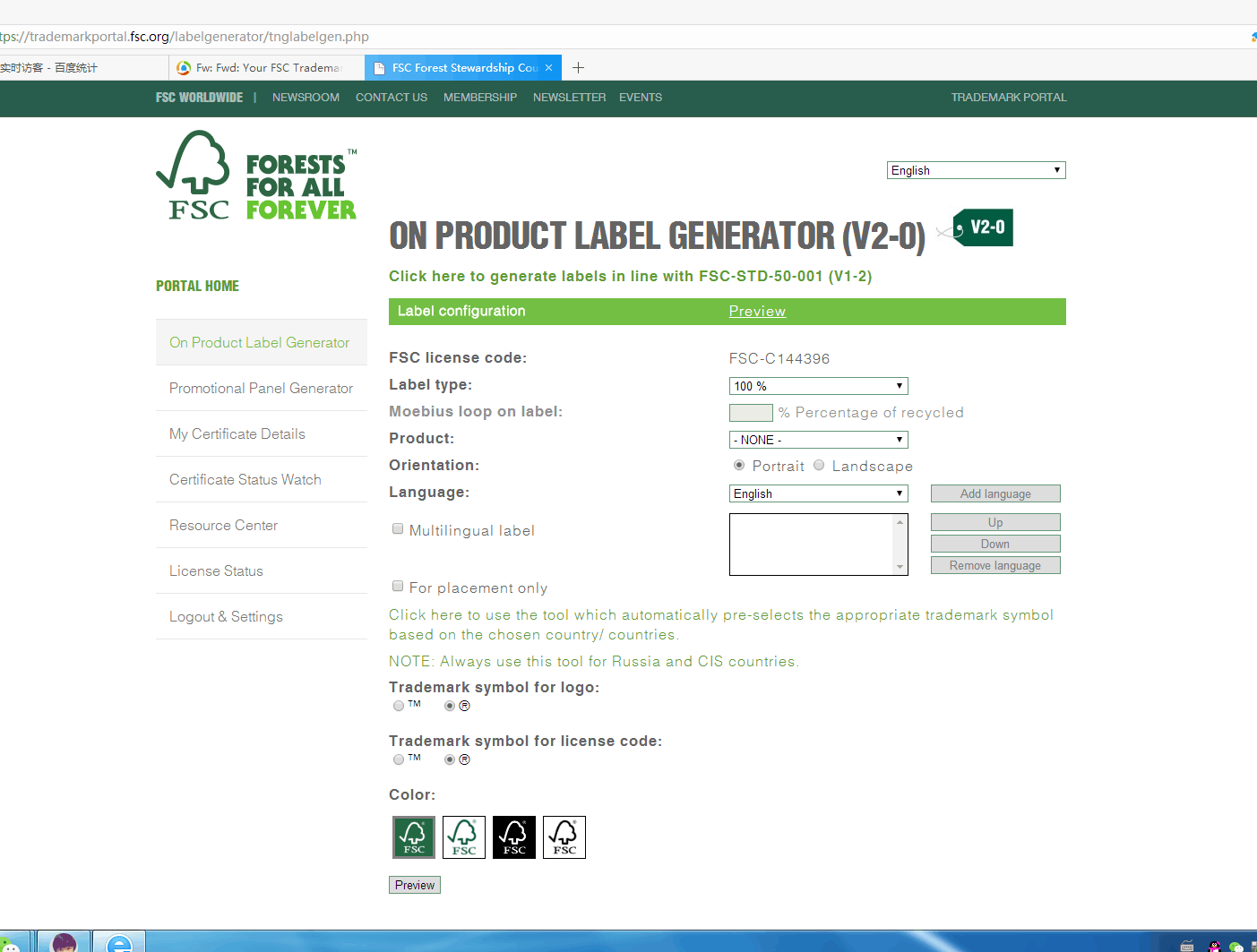进入后自己在官网上下载一个FSC的LOGO,标识横着排和竖着排都可以,需要自己选择,还有标识的颜色都是可以自己选择的,看标识放在那里的整体感觉。见下图。如需要协助,可以找东方信诺资深方老师。谢谢!