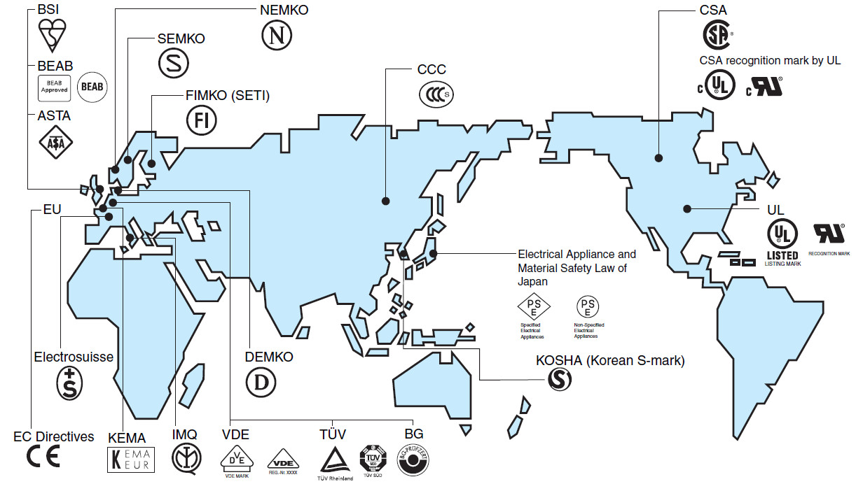 中国的3C认证,其实和欧洲的CE认证,北美的UL认证,CSA认证等等类似,下图是一张全球不同国家强制认证及其代表性标识的分布图。